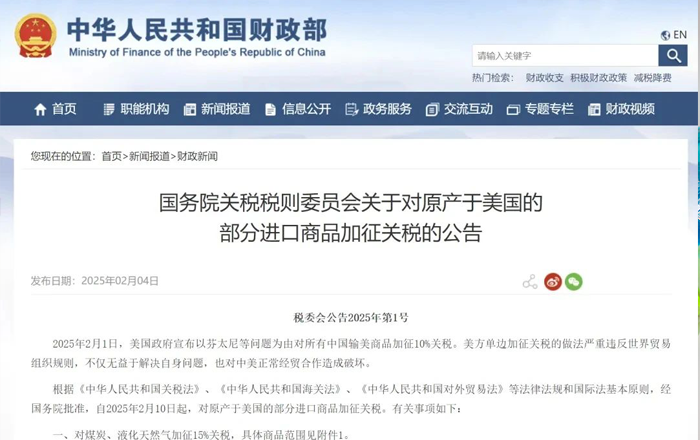 税委会公告2025年第1号 2025年2月1日,美国政府宣布以芬太尼等问题为由对所有中国输美商品加征10%关税。美方单边加征关税的做法严重违反世界贸易组织规则
